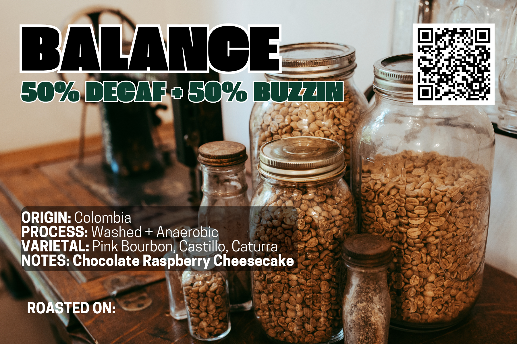 50% decaf + 50% buzzin. Featuring coffees from two producers, this blend combines a clean, washed coffee with a funky, fermented decaf that has been washed in sugarcane juices.